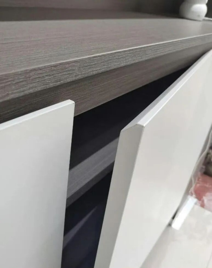 媳妇坚持选的亮光柜门,看着没有哑光柜门那么有质感,但耐油污能力强,表面有一层PM膜,光滑细腻,手印、油污沾上了,用湿抹布轻轻一擦,立马干净如新,一点痕迹都不留。