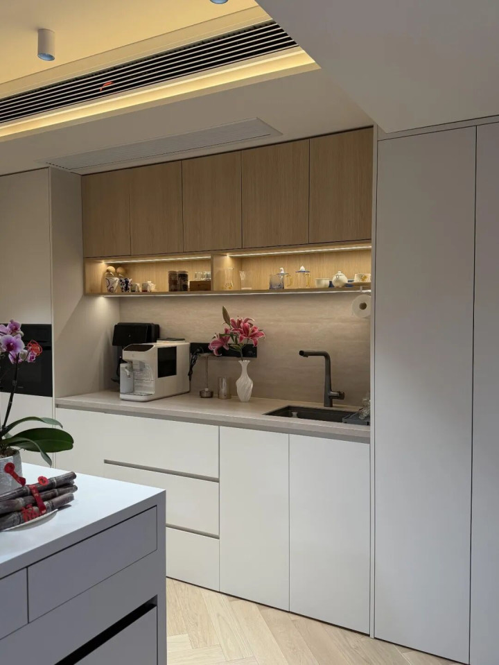 上面吊柜内退250cm,在台面操作时不撞头,装个灯带氛围感拉满。