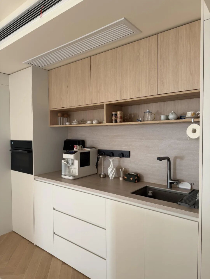 台面高度940cm,洗杯子不费腰,深度600cm,直饮机、咖啡机或其他小家电能轻松放在台面,台面嵌入吧台水槽+净水器水龙头,喝水、洗水果不用跑厨房,随手就能搞定,朋友来聚餐还能当临时操作台。