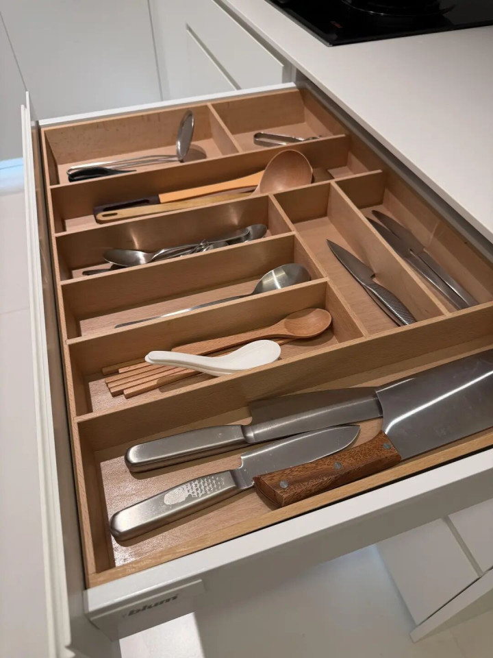 第一层:薄抽(餐具专属区)定制分隔盒放刀叉勺筷。