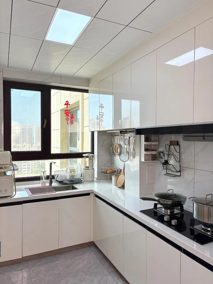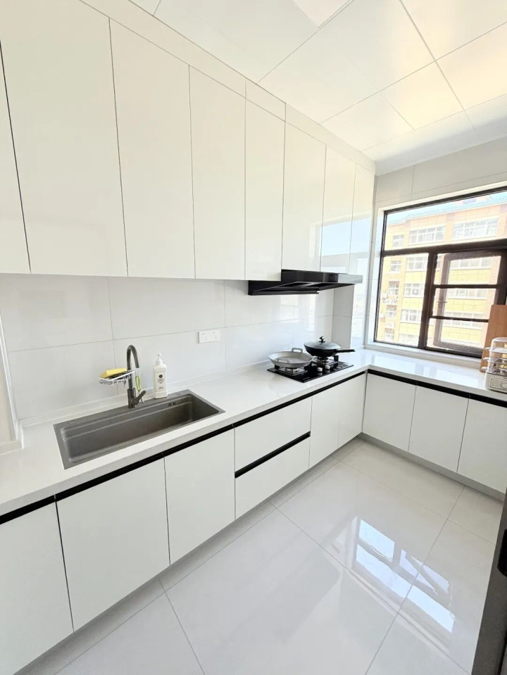 亮光柜门还有反光效果,我家厨房不算大,装了米白色的亮光柜门,视觉上显大一圈,显得特别通透,一点不压抑。
