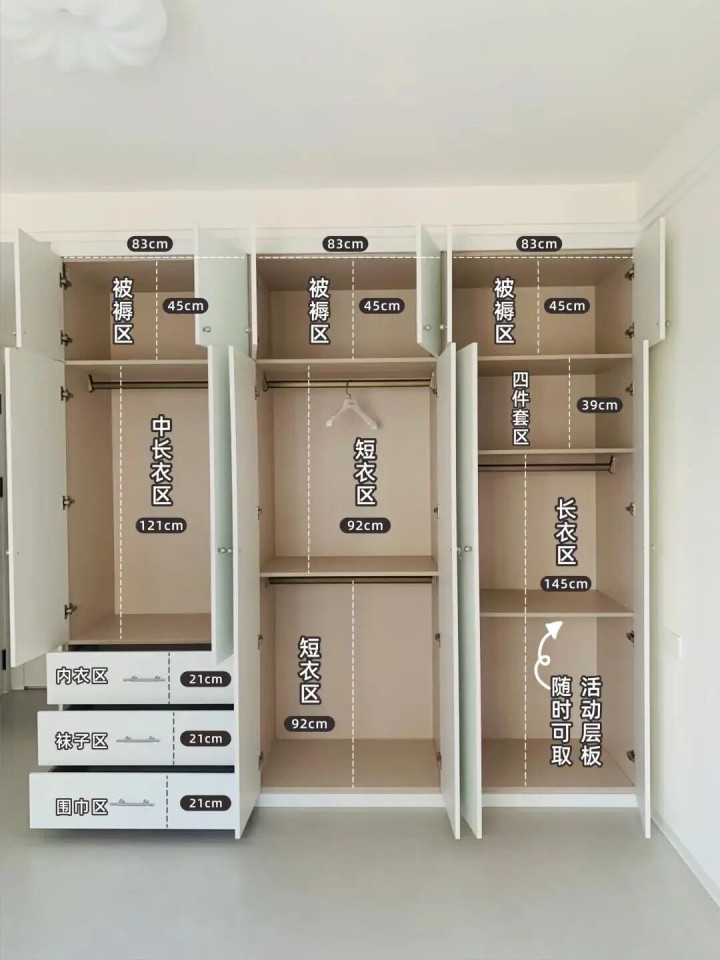 媳妇坚持做的衣柜,最上面的空间用来放被褥和过季衣服,其他分段式设计,就能防止柜门变形,挂衣区(短衣+中长+长),右上角还留了四件套区。