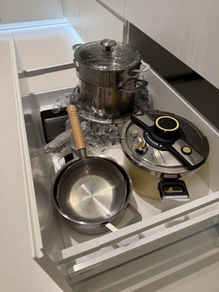 第三层:深抽(锅具收纳区)平底锅汤锅统统立着放,带把手也能完美收纳。