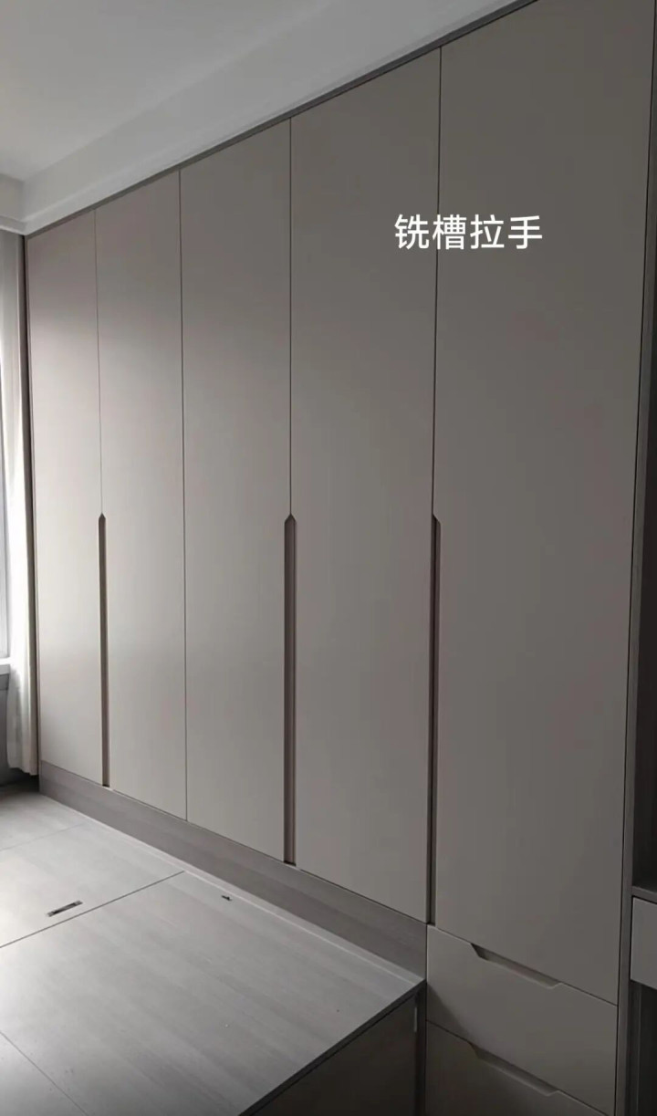 第一种,铣槽拉手,在柜门表面铣出一个凹槽,和柜门融为一体,简洁又美观,适合衣柜、家政柜这种柜门比较长的柜子。