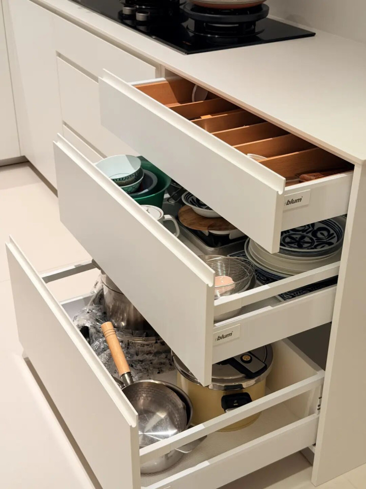 橱柜好不好用,关键看抽屉多不多!当初我觉得,橱柜做几个柜格就够了,媳妇却坚持多做抽屉,说“用的时候你就知道香了”。