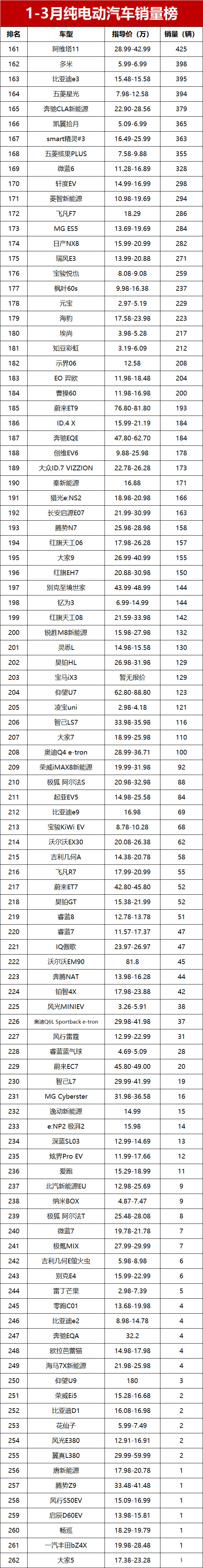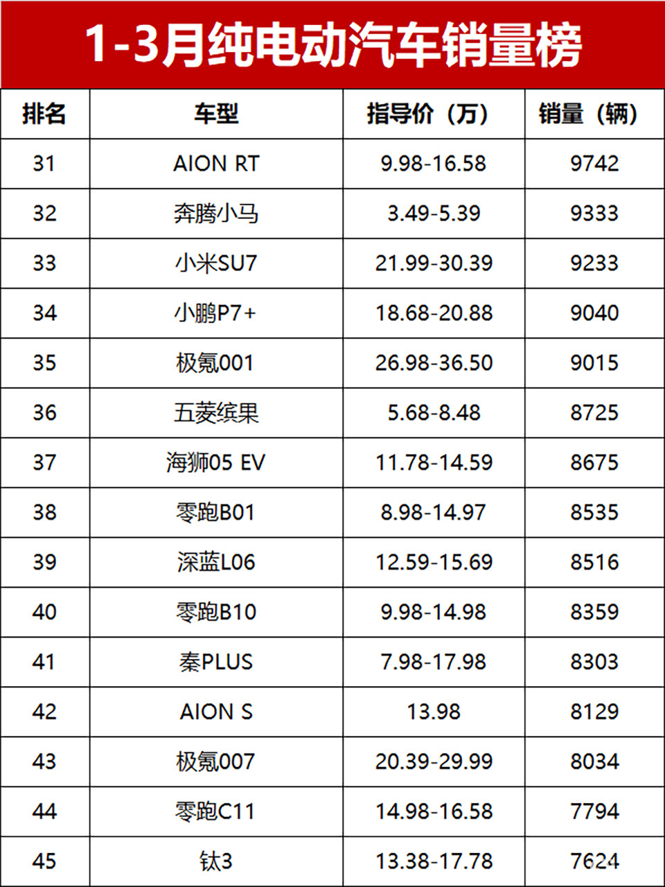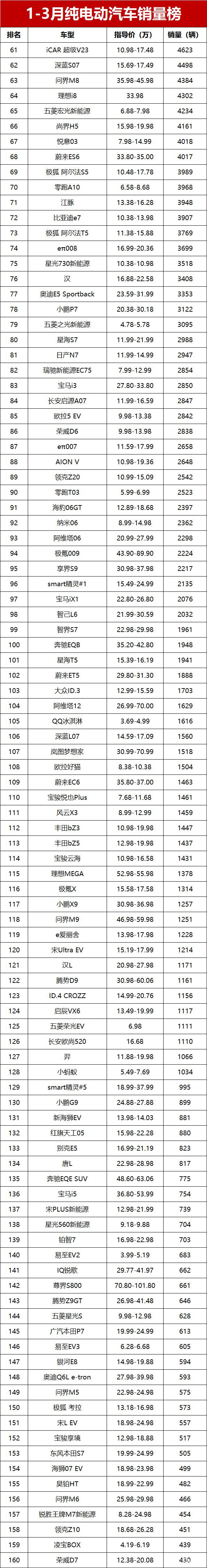 咱具体唠唠这个榜单,一季度纯电销量破万的车型,一共30款,其中累计销量超过3万辆即月均销量破万的纯电车则只有7款。说句实在的,大部分都是咱们国产车,合资和豪华品牌没占几个名额。星愿这台车,是真的逆袭了,直接冲到了榜首,卖了87322辆,比第二名多出去好几万,妥妥的一季度最大黑马!而且它指导价才6.88-9.88万,就是个平价代步车,能卖这么火,说白了就是性价比拉满了。紧随其后的是特斯拉Model Y,卖了81958辆,稳坐第二,也是前三里唯一一款不是国产车的。听说它上海超级工厂,一季度交付量特别顶,也直接带动了国内的销量。
